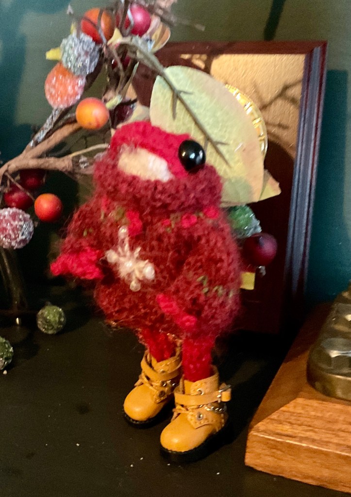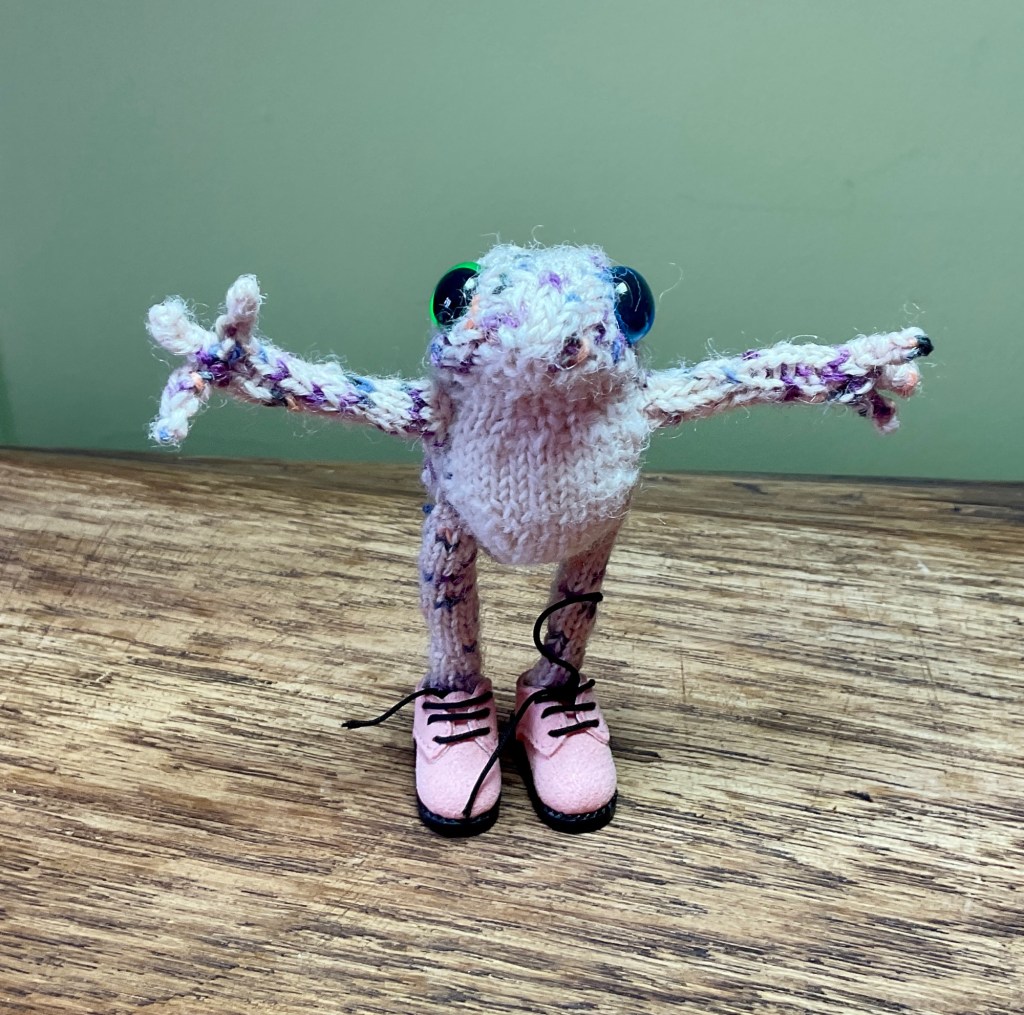 The small frogs stand around 3.5 inches tall. The taller ones approximately 5.5 inches. Hugh is even taller. I say stand, they balance quite nicely with shoes. They do have metal armature in them for gentle posing which means they are not suitable at all for children under 14 (just in case) If the armature is repeatedly bent a lot it will eventually snap. The small ones are generally knitted from alpaca wool, the taller ones generally acrylic, all have safety eyes that are no longer officially safe as I had to cut the backs down to fit in their heads. The shoes do come off but they won’t stand without them. The best way to help them stand is the hold the feet to the ground and wobble the body gently. I charge an adoption fee of around £65 per frog to keep in line with the law on collectibles (otherwise I would have to have them all CE tested, they won’t pass due to the metal in them and it’s an excessively expensive process) in the UK. They all come with, clothes, a crocheted blanket and pillow, and some little extras that I tend to theme to the frog itself. (Cost may very rarely change depending on clothing and accessories.) Postage is £5.50 for the UK. For elsewhere it is at international postage costs and possibly plus tariffs. Payment is either through PayPal or BACS bank transfer (UK only) when you are happy with what I’ve made.